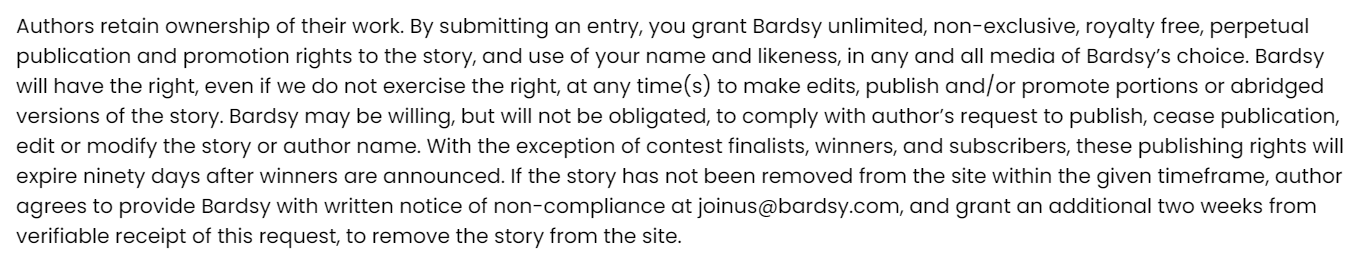 Finalists will now receive a free Elite membership for three months. And the grant of rights has been amended to release the rights of non-winners 90 days after winners and finalists are declared, and to remove the language allowing Bardsy to publish without the author’s name: