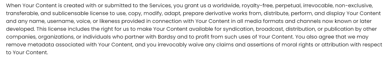 The waiver of moral rights has also been removed from Bardsy’s User Agreement.
